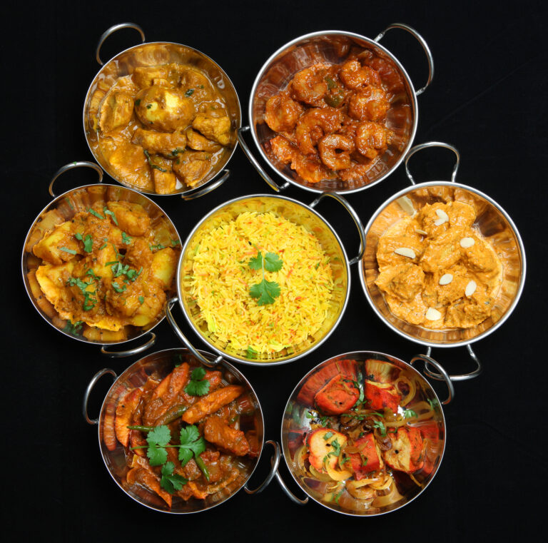 Selection of Indian curries and rice.